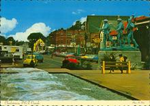 Colour photograph looking up Great George Street from Province House showing the Soldier's Monument and the fountain in the foreground.
