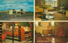 Four colour photograph showing the interior and exterior of the Kirkwood Motorist Hotel.