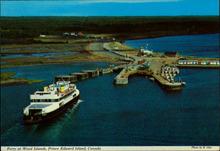 A photograph of a ferry at Wood Islands with trees and houses in the background.
