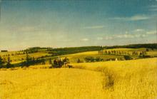Colour photograph of a wheat field. A farmer on a horse is harvesting the wheat and a dog is running in front of the horse.