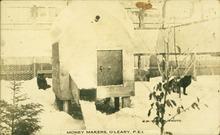 Black and white photograph of a silver fox enclosure. Two silver foxes are in the enclosure sitting near their house.