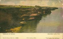 Plastichrome photograph of the Kildare Cape's Terrace of Rocks. A fence divides the area and a man is on the edge of the terrace.