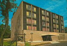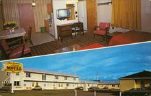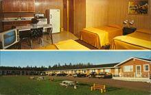 Two coloured photograph of the MacQuarrie's Lighthouse Motel now the Baker's Lighthouse Motel. The top photograph shows the interior, and the bottom shows the Motel from the street.
