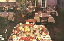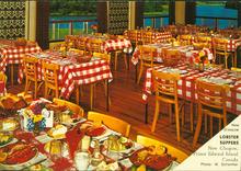 A Plastichrome photograph showing a decorated table in the Fisherman's Wharf Lobster Suppers in Rustico, PE.