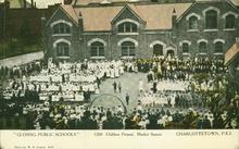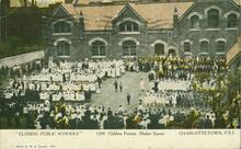 Coloured photograph of children in front of a school, with a crowd surrounding them. The crowd is gathered for the closing of the school.