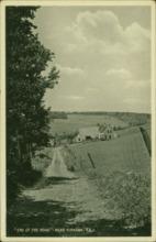 Black and white photograph showing fields and a farm house in the distance near Hampton.