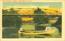 Black and white photograph of a bridge connecting the two sides of the Dunk River. A flag of the Dominion of Canada is to the top right.