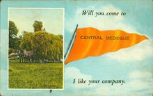 Colour photograph to the left of a horse drawn wagon loaded with hay. On the right at the top are the words "Will you come to." Underneath is a flag with "Central Bedeque" written on it. At the bottom are the words "I like your company."