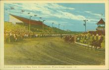 Coloured photograph showing the Exhibition Grounds and Race Track in Charlottetown. A crowd is watching a harness race that is underway.