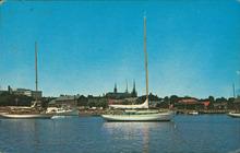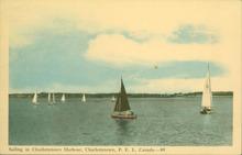 Coloured photograph showing a number of sail boats sailing in Charlottetown Harbour.