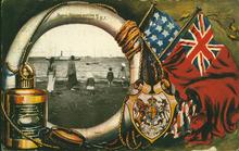 Stylized postcard showing a black and white photograph of a ship framed by a life buoy. Next to the life buoy are two flags, a coat of arms, and a lantern.