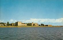 Colour photograph showing a view of the Sacred Heart Home and Charlottetown Hospital seen from across the Harbour at Victoria Park.