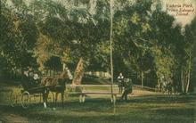 Coloured photograph of Victoria Park. Two horse drawn carriages and people sitting on a bench can be seen.