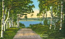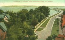 Coloured photograph of Victoria Park and Charlottetown Harbour which is visible in the background.
