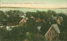 Coloured photograph overlooking Kent Street, Victoria Park Roadway, and West Street. The Charlottetown Harbour can be seen in the background.