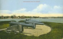 Coloured photograph of the Prince Edward Battery looking towards Charlottetown from over the cannons