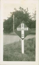 Black and white photograph of a sign with "1 Killed, Apr 51" written within the white cross on the sign.