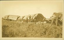 Coloured photograph showing a shore scene on P.E.I.. Two broken boats are floating by the beach, and a number of other sailboat in the background.