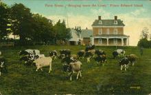 Coloured photograph of a farmer herding cows with a farm house and buildings in the background.