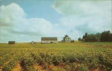 Colour photograph showing a potato field with a farm house and barn in the background.