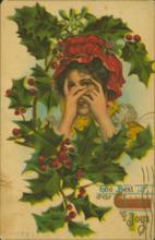 Hand drawn and coloured photograph of a woman hiding her face while being surrounded by mistletoe.