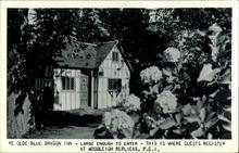 A collage of 3 pictures: top left- the frontal view of buildings with people sitting outside; top right- view of the kitchen with 3 tables and chairs; bottom- the street view of buildings and trees. Published by Tichnor Bros.Inc. Made in Boston, Mass., U.S.A.
