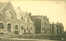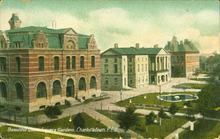 Black and white photograph of the Public Buildings of Charlottetown including; the old Post Office, Province House, and the Law Court.