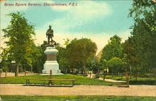 Coloured photograph of the Queen's Square Gardens and the public buildings in Charlottetown; the Post Office, Province House and the Law Courts.