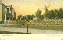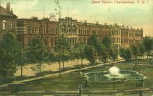 Coloured photograph of Queen Square. Province House, the Court House, and the War Memorial can all be seen.