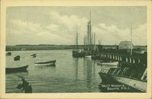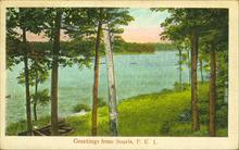 Plastichrome photograph showing a shore near Souris. A few broken boats can be seen in the water.