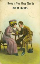 Plastichrome photograph of a couple sitting at a table drinking with straws from the same cup.
