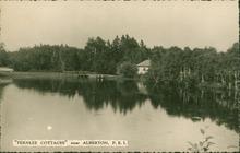 Black and white photograph of a river looking toward "Fernlee Cottages".