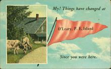 A coloured drawing of a red flag with O'Leary P.E. Island written on it and a plastichrome photograph of two cows eating grass.