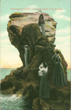 Plastichrome photograph of a group of people climbing on a group or rocks known as Nature's Pulpit.