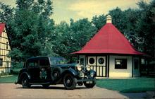 A plastichrome image of a lodge, cottages and trees in the background, and farmland in the foreground. Plastichrome by Colourpicture. Published by Island Wholesale. Made in Charlottetown, P.E.I., Canada.