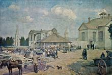 A hand coloured image of Vendors selling items and People gathered on a balcony in the background. Painted by Spencer Macky. Publisher not known. Printed in Canada.