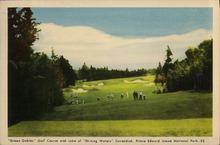 A hand coloured image of the scenic view of Green Gables Golf Course with players surrounded by trees and sand traps.