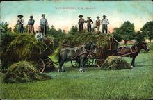 A hand coloured image of farmers on carts with hay that are attached to horses in a field. Published by C. & Co. Ltd. Made in Canada.