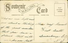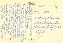 A hand coloured image of the frontal view of a Hospital with cars and plants in the foreground. Published by Royal Sales Co. Made in Summerside, P.E.I., Canada.