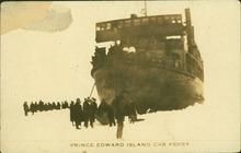 Black and white photograph of the Prince Edward Island Car Ferry. The ferry is stuck in the ice allowing people to leave the ferry and stand on the ice.